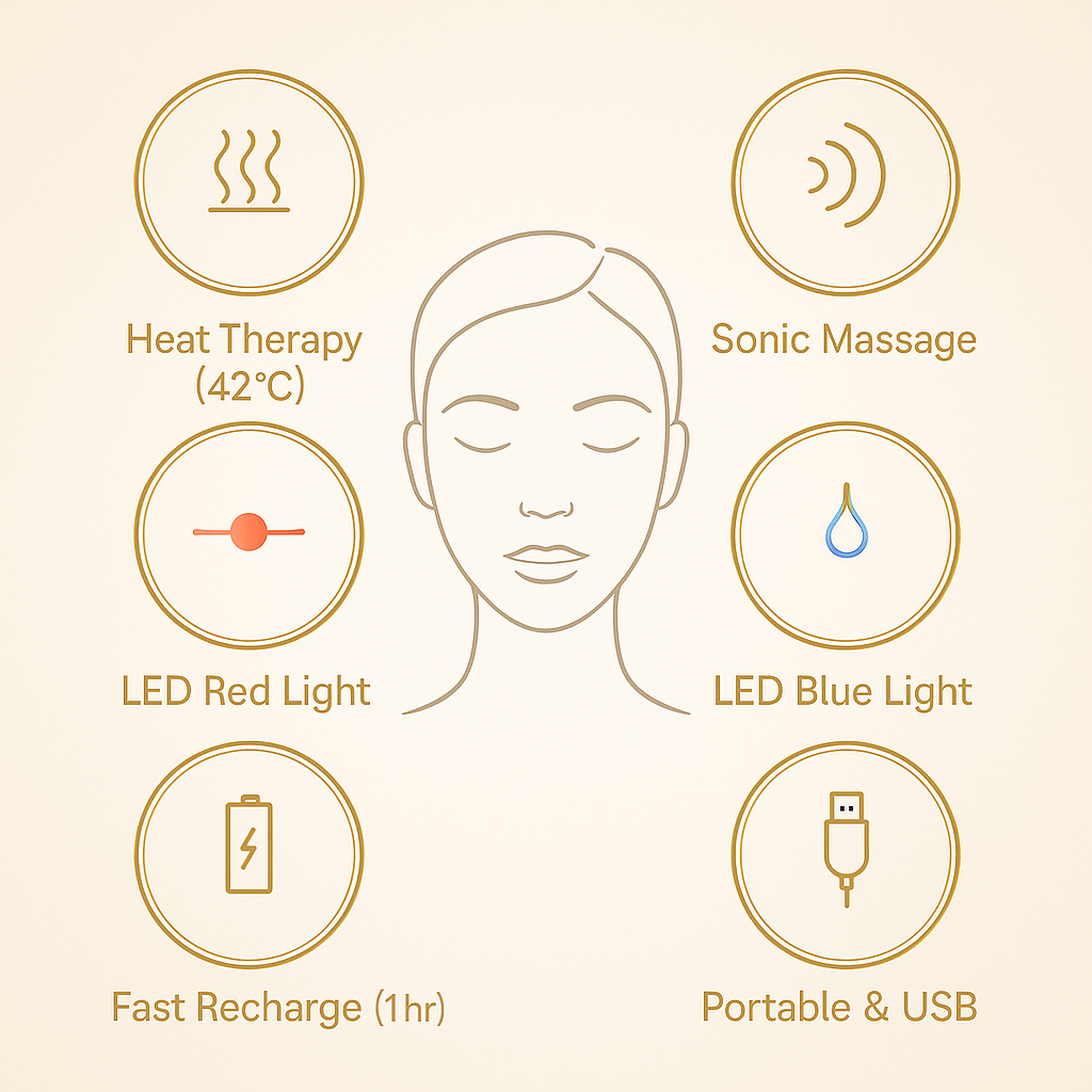 Its gentle heat, LED technology, and micro-vibration support blood flow, collagen production, and better absorption of your skincare — helping your eyes look firmer, smoother, and more awake.