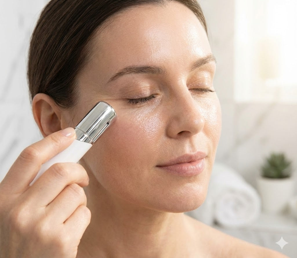 Gently glide the wand head under your eyes, moving from the inner corner outwards toward your temple. This "sweeping" motion encourages lymphatic drainage. Repeat for 3–5 minutes per eye.